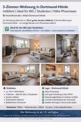 Zur Vermietung steht eine ca. 70 m² große, bereits möblierte 3-Zimmer-Wohnung in Dortmund-Hörde (Hochofenstraße), nur wenige Minuten vom Phoenixsee entfernt inkl. Einbauküche.